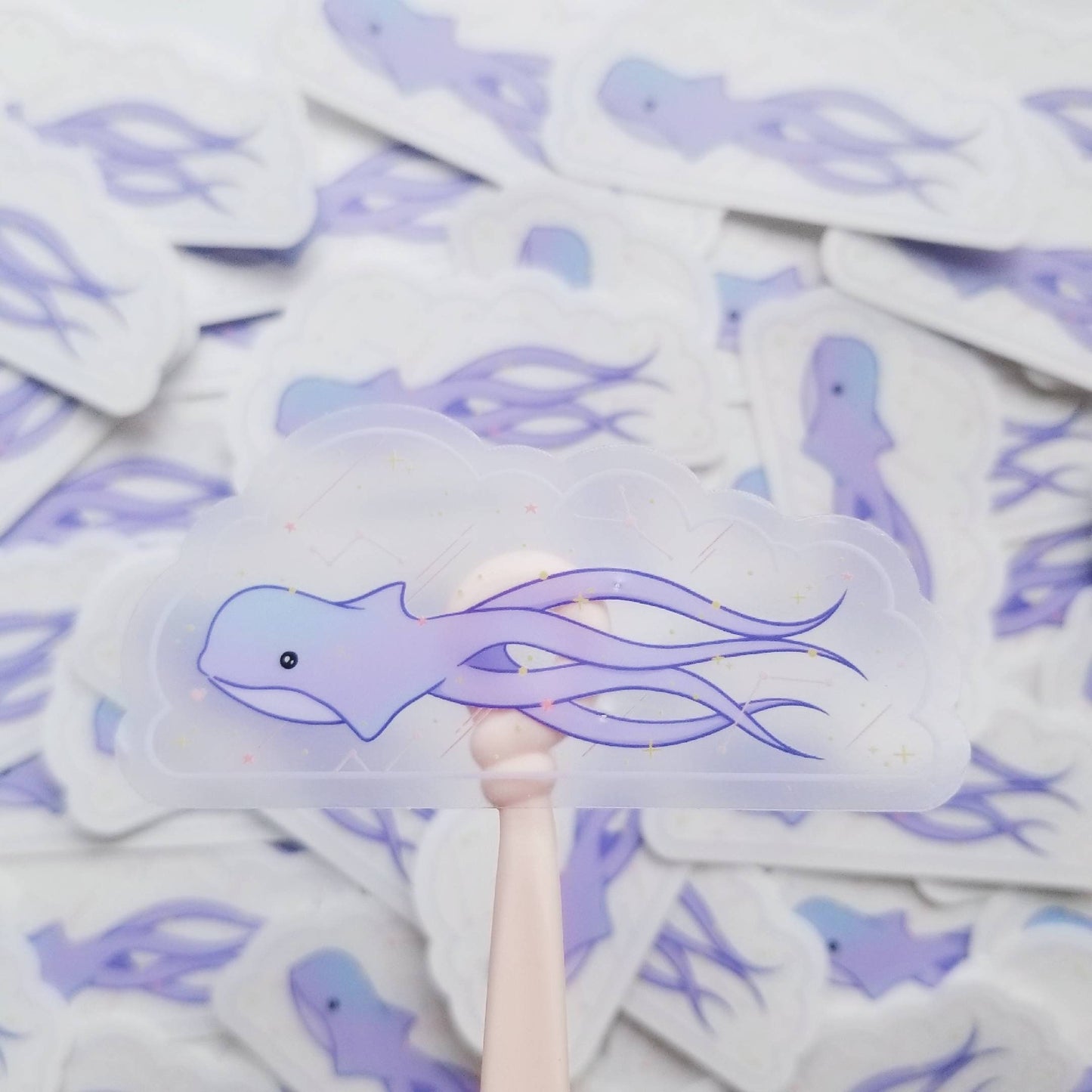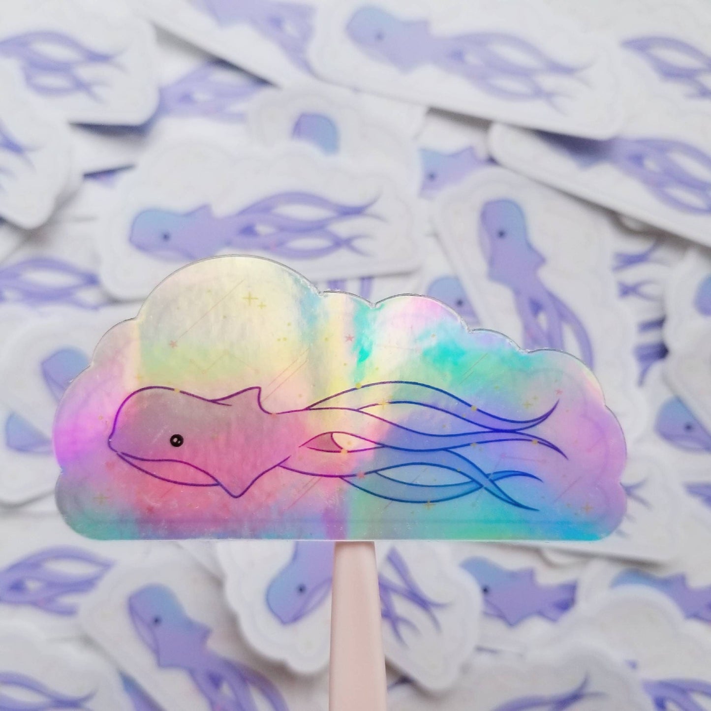 A dreamy purrgil available in two finishes- clear and holographic. This vinyl sticker measures 3" long and is weatherproof and waterproof--perfect for water bottles, laptops, notebooks, and more!