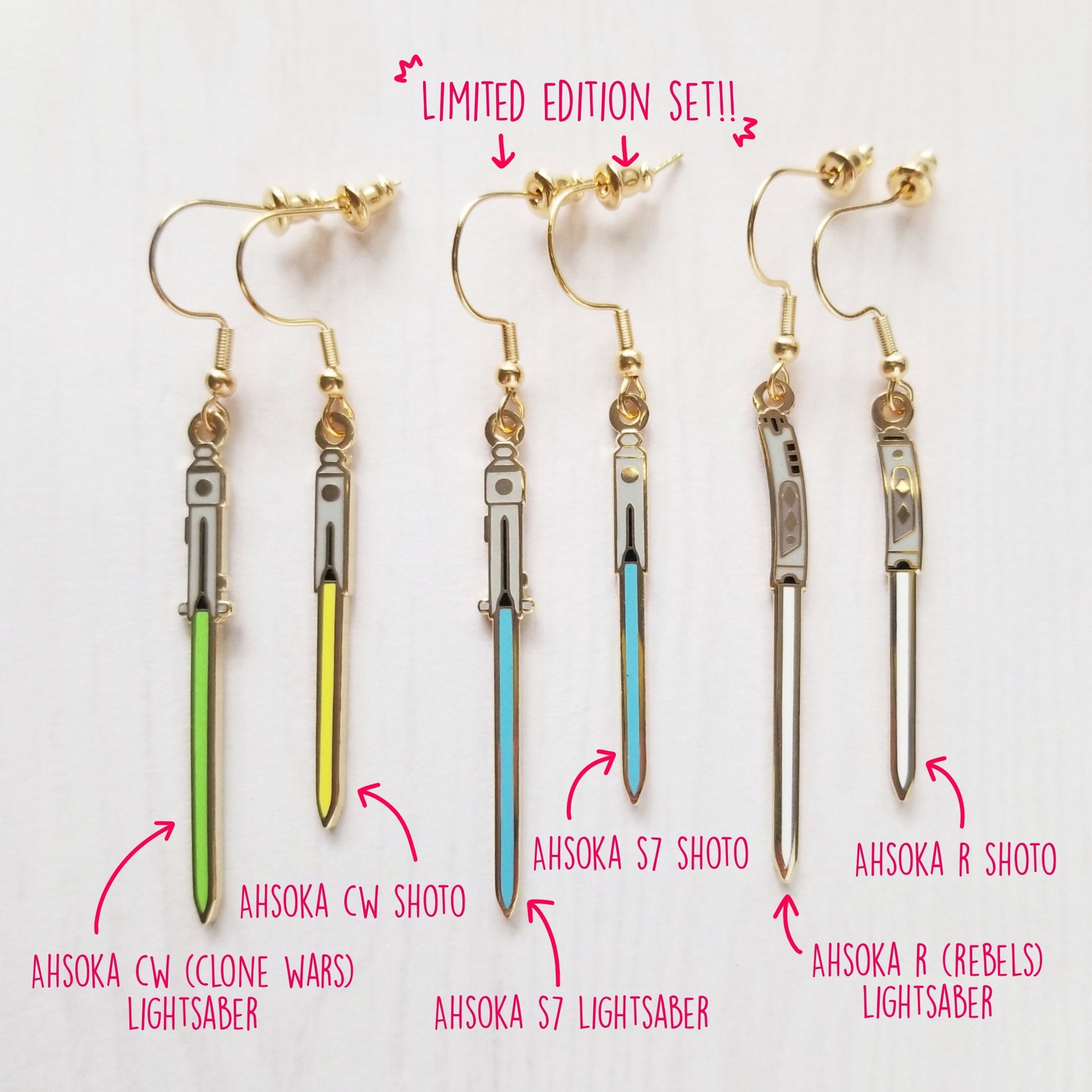 DESIGNS: there are 13 total different designs to choose from. Please swipe through the photo gallery to see all the options! AHSOKA'S BUNDLE: includes one of each Clone Wars lightsaber, Clone Wars shoto, Rebels lightsaber, and Rebels shoto for a total of 4 earrings.
